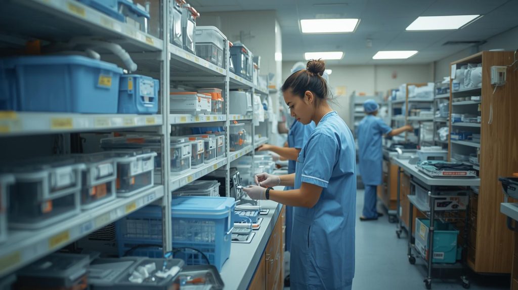 After sorting, staff organize the remaining items so they can find them easily. Every tool, medicine, and device receives a fixed location.